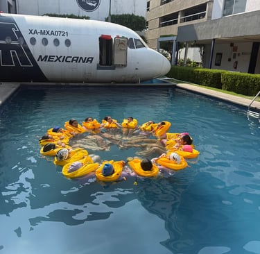 La primera es el ditching, un entrenamiento especializado donde el alumno enfrenta un escenario de amerizaje de emergencia y aprende a evacuar, coordinar y manejar equipos de flotación con seguridad y liderazgo.